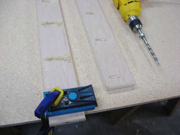 Utilicé tornillos de agujero de cola y bolsillo junto con las pinzas para sujetar las piezas de dos piernas juntas. Si usted decide hacer lo mismo, se enfrenta al bolsillo agujeros son perforados en el interior de las piezas de pierna más estrechas de D, a lo largo de los bordes que no fueron.
