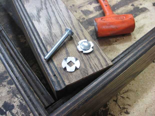 Para una mirada limpia, opté por usar 5/16" diámetro 2 3/4" los pernos de carruaje para sujetar las piernas de los marcos. Junto con los pernos de carruaje, también usé estas cosas sin centrifugado lavadora de puntiagudos dientes.