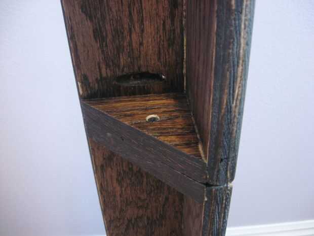 Fije cada par de piernas juntos a través de las piezas triangulares con un 1 1/4" tornillo en un agujero previamente taladrado y avellanado. Recomiendo usar abrazaderas para mantener las piernas en posición como pre-perforar este agujero.