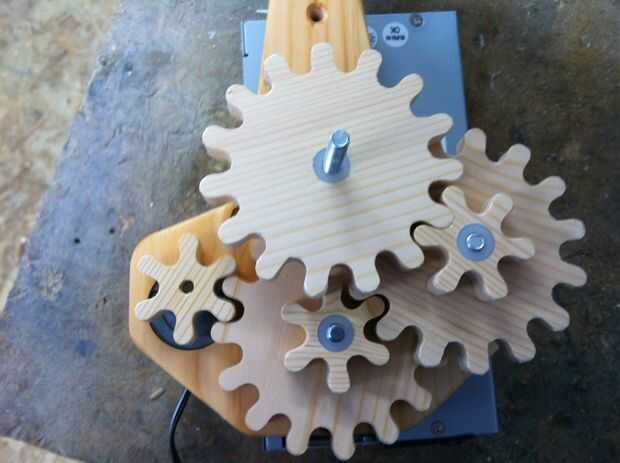 El conjunto de engranajes puede parecer complicado pero relativamente sencillo es asumiendo usted recortar correctamente el moount de engranaje, cada cosa deben line.  Para comenzar, presione en el 1/2" espaciador de plástico en los agujeros de centro de 1/2" en 5 de 6 marchas.  El sexto engranaje debe tener un orificio de 3/16" para presionar en el motor.  Pegamento 6 dientes engranaje a engranaje de one15tooth por lo que tendrá dos engranajes se unieron.  En la imagen siguiente muestra los pernos a través de engranajes de 2, los tornillos se utilizan sólo para mantener los engranajes concéntricos.