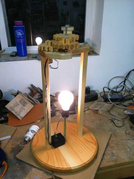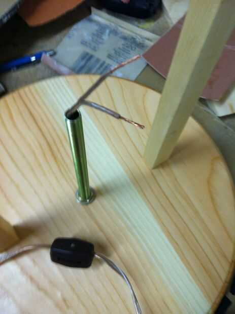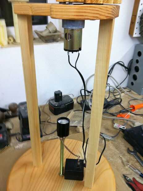 El diseño eléctrico debe utilizar un cable de alimentación de la lámpara con un interruptor giratorio o similar y alambre de la cubierta de la bombilla y la verruga de la pared al cable de alimentación, de esta manera que se encenderá la bombilla y la lámpara girará sin necesidad de interruptores separados o 2 cables va a la lámpara.  Instalar el hardware de la lámpara y fije el zócalo del bulbo en la parte superior.  Alimente el alambre a través de la extensión y coloque otro cable corto que irá a la verruga de la pared.  El zócalo del bulbo debe tener terminales de tornillo donde se Conecte ambos cables.  El cable con la verruga de la pared tendrá que soldarse a los terminales.  El cable de la fuente puede ser asegurado a uno de los soportes de montaje y caliente pegado en unos pocos lugares para proteger el cable.  Corte el alambre a la longitud adecuada y la soldadura del motor.  El motor puede correr hacia adelante o hacia atrás para decidir qué dirección desea que la sombra a girar.  Asegúrese de que funciona la lámpara, el motor y el interruptor.