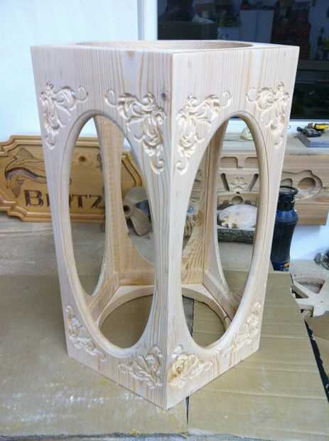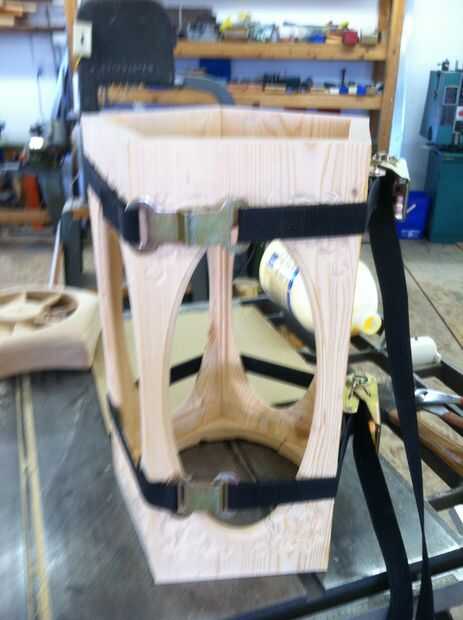Usé pegamento de madera principalmente para unir las partes.  Cuando sea necesario, también utiliza clavos para ayudar a ayuda en el montaje de 5 piezas para mantenerlas en su lugar.  también se utilizaron 2 correas para recorrer la Cortina entera para sostener todo apretado.  Si su lámpara marco parte es no perfecto cortarlo al tamaño en consecuencia.  El marco ayudará a asegurándose de que todas las 5 partes son las mismas en lugar de confiar en los anges angulares de cada marco de litho.  Una vez seco el pegamento, fije el ajuste moldeado alrededor de la parte inferior de la pantalla.  El tapón superior también puede pegarse a la parte superior de la cortina. -El eje se puede instalar ahora en la tapa superior.  Instale el material de lithopanes o difusor en el hueco del marco litho y asegúrelo con una pequeña cantidad de pegamento caliente.