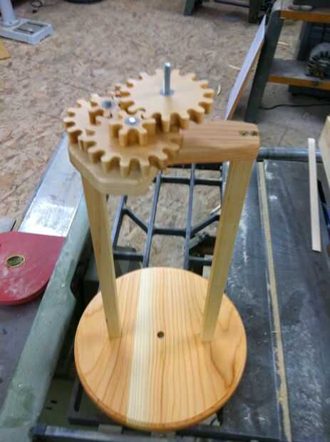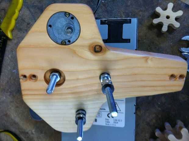 Conecte el ' Monte suppor't piezas a la base usando los tornillos para madera #8.  Una vez seguro, retire los engranajes del montaje del tren de engranaje y coloque el montaje del tren de engranajes al extremo opuesto de las 'ayudas de montaje' usando el mismo tipo de tornillos.  Reemplace los engranajes y si no han hecho así todavía, la empaquetadura de fricción se aplican a la parte superior más engranaje usando un adhesivo en aerosol.