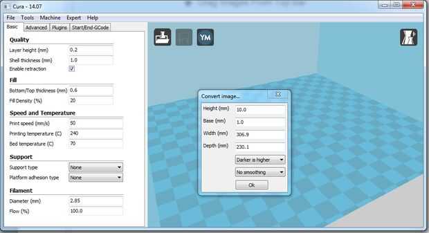 Como se puede ver, hay algunas opciones disponibles para usted. El más fácil por supuesto es usar Cura ya que puede usarse ya para. Desde la versión 13.11, Cura admite imágenes de importación y conversión en 3D las mallas. Es bastante sencillo, arrastrar & gota o seleccione Carga modelo del menú de Cura luego una imagen jpg en lugar de un archivo de stl. Aparecerá un diálogo pidiéndole que seleccione el tamaño (ver foto). Tienes que mantener la opción «más oscuro es superior» y puede que desee habilitar la opción de "Suavizado de luz", o no, dependiendo de su preferencia. Para otras opciones, es mejor leer los pasos para obtener más información.