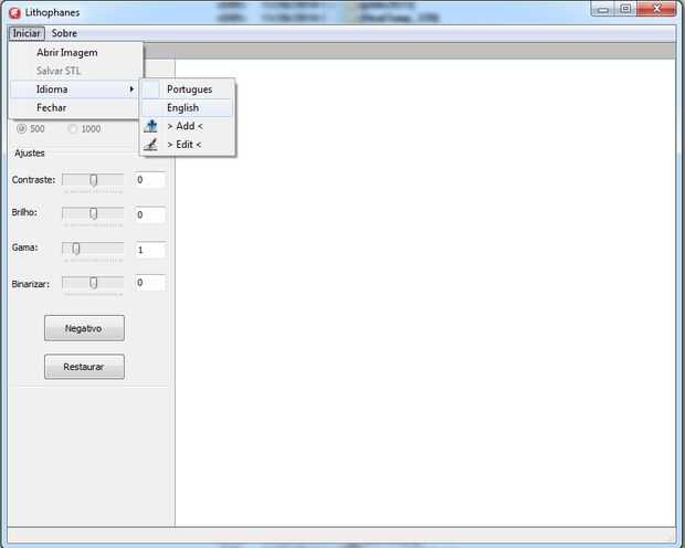 Desafortunadamente, mientras que Cura es la solución más fácil, carece en términos de opciones a la hora de cargar la imagen. La mejor aplicación que he encontrado es utilizar la aplicación Lithophanes. Está en un sitio brasileño, así que aquí está el enlace directo al instalador. Después de instalarlo, se establecerá en Portugués de forma predeterminada, pero puede configurar el idioma a Inglés por el menú de Start , luego Idioma y finalmente seleccionar Inglés. Esta es la aplicación que va a utilizar en este Instructable.