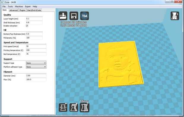 Por último, y una cosa muy importante es elegir el derecho de cortar el programa. Normalmente utilizo Slic3r para todo, pero en el caso de Lithophanes, tengo que usar Cura porque es mucho más rápida de los modelos de la rebanada. He utilizado Slic3r para cortar una Litofania de Faro de 50x37mm y tardó unos 30 minutos en un Core i7, mientras que tarda menos de 1 minuto para corte en Cura. Para el koala 100x75mm, Cura lo rebana en unos 2 minutos mientras Slic3r más de 5 horas a rodaja 35% entonces simplemente lo dejé. Para mi foto de bebé de 100x130mm, tomó unos 45 minutos a slice en Slic3r mientras que tardó 1 minuto en Cura. Como se puede ver, la diferencia en velocidad es enorme, pero todavía prefiero usar Slic3r cuando es posible, dependerá del tamaño y sobre todo en el nivel de detalle de cada Litofania. Si hay un montón de espigas (detalles), como la imagen de Koala por ejemplo, será mucho más difícil para cortar que una imagen con áreas más uniforme.