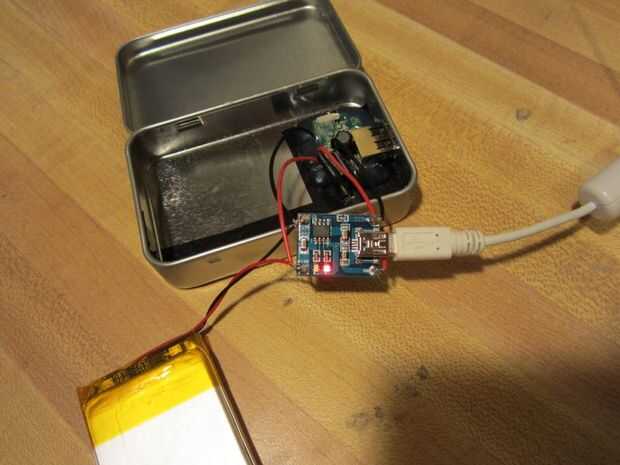 Ahora puede ya sea cargar la batería mediante el puerto USB en el circuito de carga o mediante energía Solar. El rojo LED en el tablero de regulador de la carga significa que la batería se está cargando, el azul aparece en cuando la batería está llena.