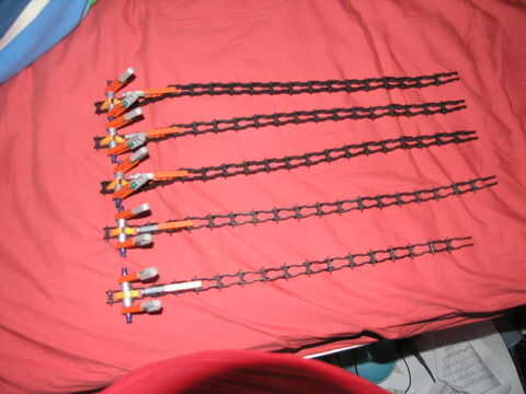 Por último, estamos en las dos últimas cosas de la máquina. En primer lugar, la cadena. Empezar por hacer 4 sets de 19 enlaces de cadena y un capturador de la bola al comienzo de cada uno. A continuación, hacer una quinta, con solo 18 links y coloque un capturador de quinto en el mismo lugar que los otros. Conectan en una cadena larga y cadena sobre los engranajes principales. Conecte todo una vez que estén todo el otro equipo.