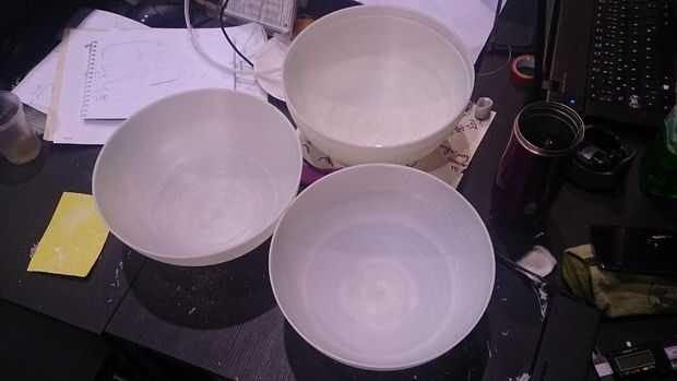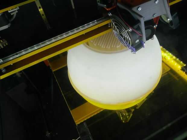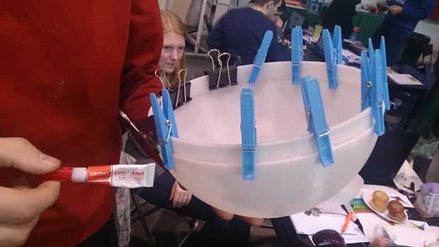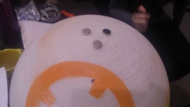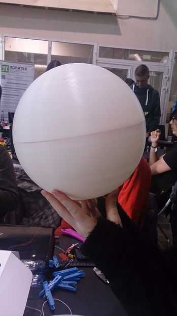 La idea sobre el cuerpo era imprimir dos piezas con impresora 3D y luego conectarlos juntos. El mecanismo de conectar dos partes juntos era bastante simple en teoría: repisas en dos semiesferas, una del lado exterior y otra del lado interno, y luego conectarlos junto con el mecanismo similar al que en kinder huevo sorpresa :) Pero parece ser más complicado y luego pensamos. Dos piezas de esta esfera (que nos tomó 24 horas para imprimir cada uno) no encajan así que tuvimos que considerar otras formas de conectar las bolas: cortamos el anillo de salientes de una esfera, imprimió una semiesfera más, un poco más pequeño que el anterior, poner dentro de la más grande para ayudar a conectar todo y muchas otras soluciones. Al final decidimos imprimir un additory anillo de reborde y péguela a una esfera. Después de eso todo conectado fácilmente.