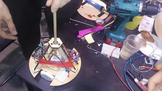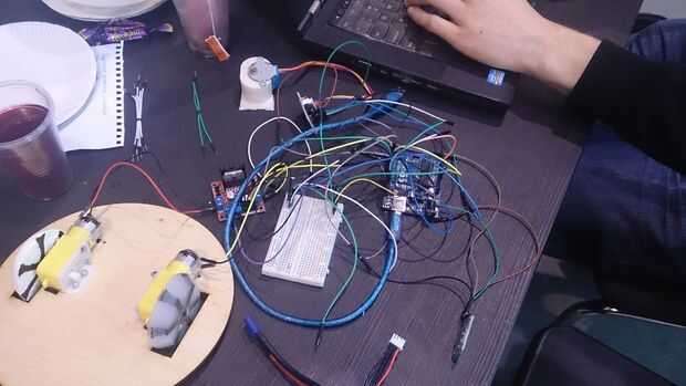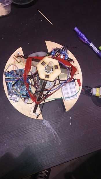 La elección final para nuestra plataforma Arduino Uno con módulo bluetooth que controla DC motores para las ruedas y el motor servo para la cabeza. El BB-8 está controlada por smartphone Android app. Utilizamos software de Arduino y Android Studio para programar nuestro robot. Responde a cinco comandos: avanzar, retroceder, parar, girar a la derecha y gire a la izquierda. No era fácil de poner todo lo que necesitábamos en la plataforma de madera contrachapada, pero cinta roja que se puede ver en las fotos nos ayudaron con eso :)