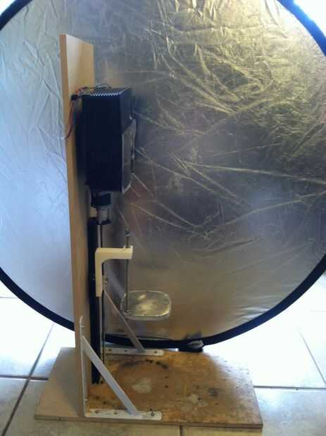 A continuación, montar el eje, el proyector y la línea de su plataforma. Como se puede ver, mi diseño es nada más que 2 piezas de MDF y algunos soportes de estante.