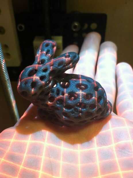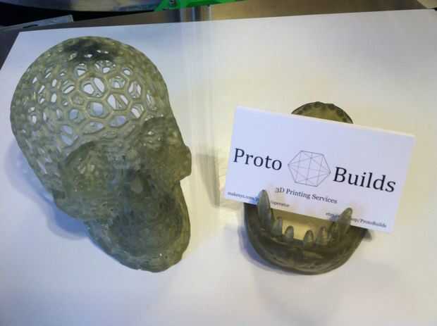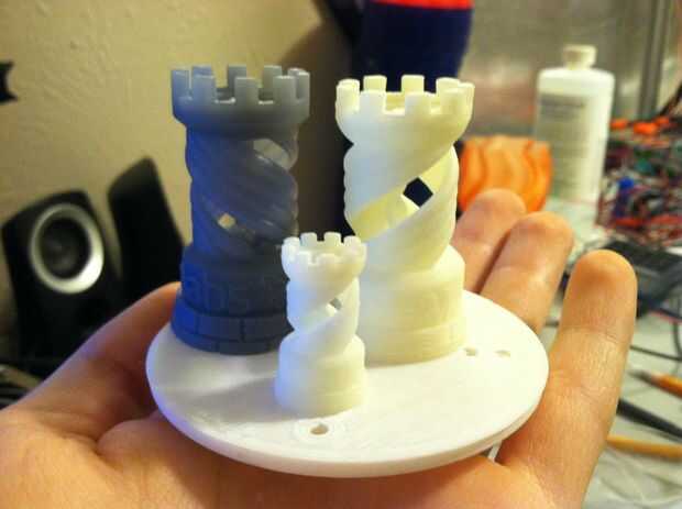 La torre gris fue una muestra de impresión de resina de SLA del Formlabs. El blanco sobre el derecho fue realizado utilizando nuestra impresora homebrew 3D DLP/SLA.