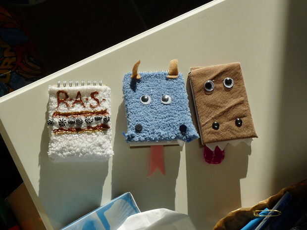Hola Instructables! Esta es nuestra entrada a la hice! concurso, son los pequeños cuadernos de monster porAlpineButterfly. Si usted está interesado, aquí está el enlace:. Hicimos algunos cambios al diseño. No teníamos ninguna imitación piel en mano, así que utilizamos otros materiales. El monstruo marrón es de cuero falso, y los azules y blancos son de re-purposed pata que mis hermanas decidieron utilizar. No disponemos de ningún libro-board para el respaldo, por lo que utilizamos algunos pequeños espiral cuadernos para la base en cambio (ver las últimas fotos...). También usamos una pistola de pegamento caliente, que el arte todo mucho más rápido (terminamos todos en una hora). y los ojos de googley. Esto es una gran manualidad para los niños, como tienen un ayudante adulto. Gracias por las instrucciones de gran, AlpineButterfly!