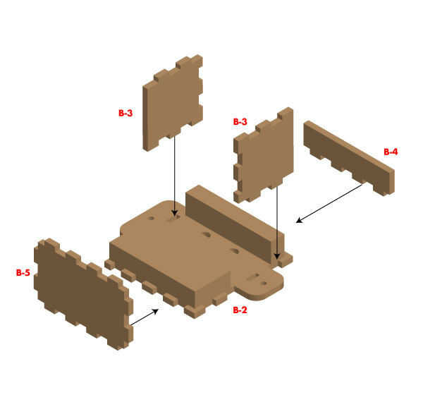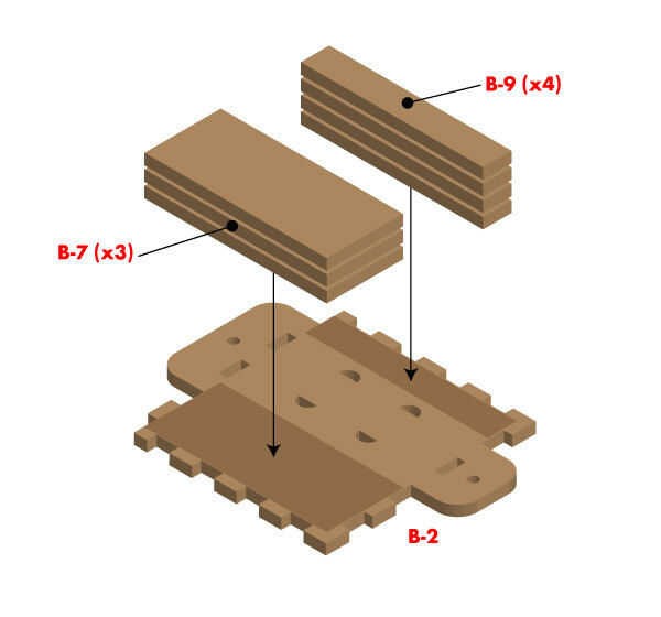 Luego pegue los lados (B-3), superior (B-4) e inferior (B-5) a la placa posterior (B-2) como se muestra en la imagen 4.