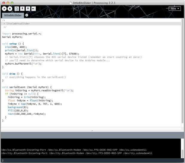 /* * littleBitsSlider */ import processing.serial.*; Serial myPort; void setup () { size(400, 400); println(Serial.list()); myPort = new Serial(this, Serial.list()[7], 57600); // Serial.list()[7] chooses the 8th serial device listed (remember we start counting at zero!) // you'll need to determine which serial device is the Arduino module... myPort.bufferUntil('\n'); } void draw () { // everything happens in the serialEvent() } void serialEvent (Serial myPort) { String inString = myPort.readStringUntil('\n'); if (inString != null) { inString = trim(inString); float inByte = float(inString); inByte = map(inByte, 0, 767, 1, 600); background(0); fill(255,0,0); rect(150,300,100,-inByte); } } El código utiliza un evento de la serie para leer los datos entrantes y actuar en consecuencia. Aquí la parte difícil es elegir el puerto serie correcto. En la configuración estamos imprimiendo una lista de todos los puertos serie que ve a su equipo. Puedes ver que he elegido el puerto serie 8 en la lista, que es conocido como Serial.list() [7] porque empezamos a contar en cero.