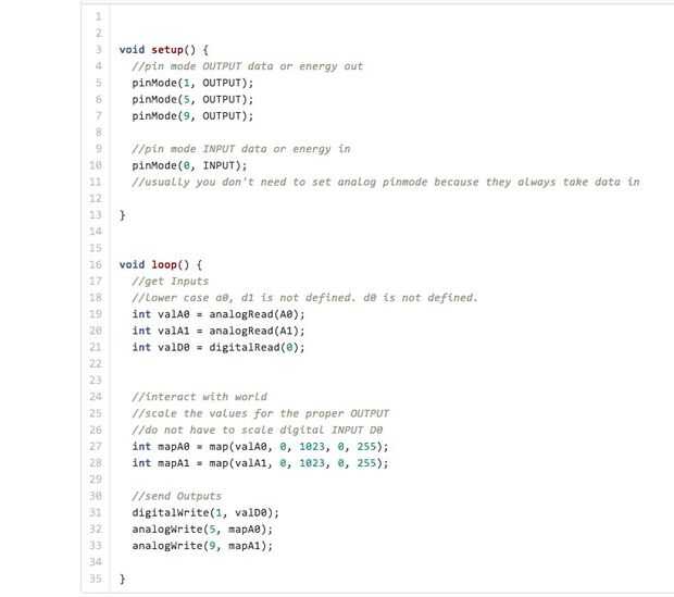 int valD0; void setup() { //pin mode INPUT data or energy in pinMode(0, INPUT); //pin mode for OUTPUT pin to send energy out pinMode(1, OUTPUT); } void loop() { //get Inputs //lower case a0, d1 is not defined. d0 is not defined. valD0 = digitalRead(0); //send Outputs digitalWrite(1, valD0); }