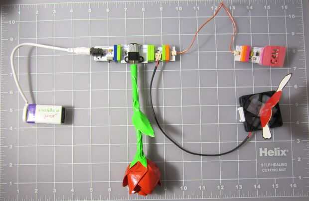 1. Conecte las piezas de izquierda a derecha: batería, cable, poco poder, broca que gira, poco fan, pedacito de alambre, poco pulso y bit RGB LED.