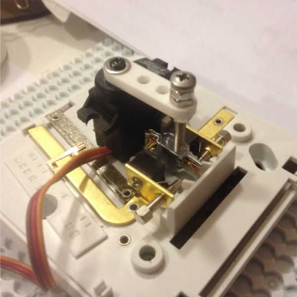 Coloque el brazo del oscilación (plantilla incluido arriba) al servo con un tornillo y una arandela. Pase un tornillo de 3mm por el brazo y luego adjuntar contacto del termostato hasta el final de la misma como se muestra en las imágenes.