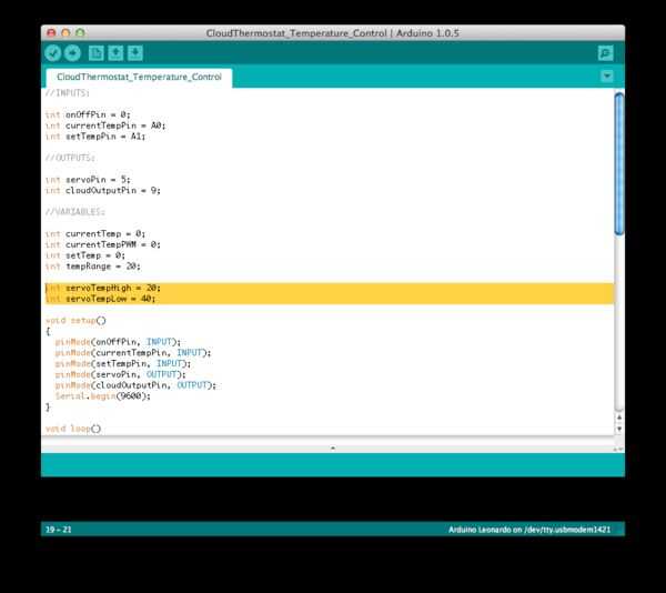 Para cambiar cuánto gira el servo, ajustar las variables servoTempHigh y servoTempLow en el código de Temperature_Control. Si intentas girar el servo demasiado, se desgastan con el tiempo, tan solo darles vuelta tanto como necesita tocar cada uno de los extremos del interruptor.