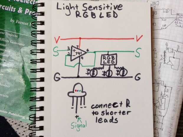 1) breadboard y prueba de que el LED puede hacer los 3 colores principales y una variedad de otros colores en el medio. Puede hacer lo que sea que cubren sobre los fotorresistores con diferentes opacidades (cinta aislante negra es casi totalmente opaca, mientras que la yema del dedo probablemente es 1/2 opaco) o, si se utilizan potenciómetros de 10K, utilice un destornillador de cabeza plana para marcar en sus colores.