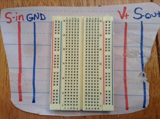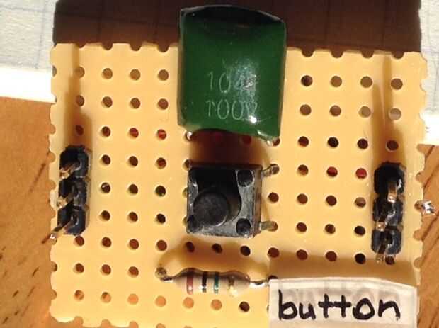 1) breadboard y prueba de que el botón está trabajando con un poco de DIY LED conectado en su protoboard. Usar carriles separados en su protoboard de señal y salida de la señal (ver imagen). Si encuentras que tu LED es descolorarse adentro y hacia fuera, que pueda haber utilizado demasiado grande de un condensador. Si el LED está deslizándose dentro y fuera, el viejo botón usado puede ser pobre.