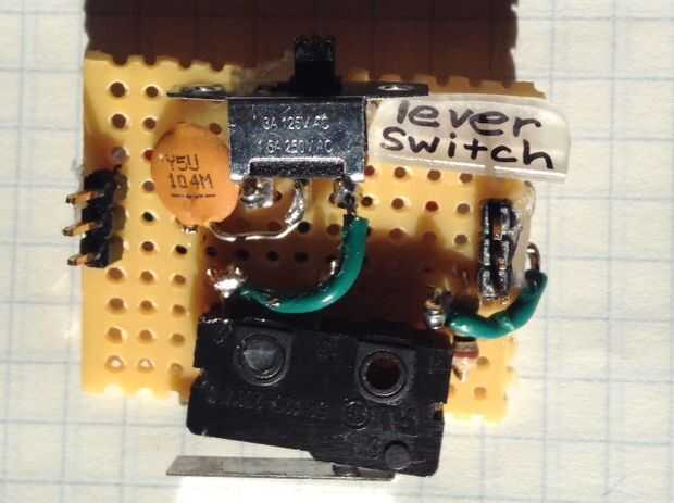 2) un micro SPDT con palanca de 3/4"(Radio Shack parte #275-0016 - también tienen la palanca del interruptor con un rodillo #: 275-017), además de un interruptor SPDT.