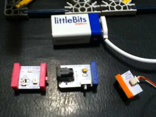 El circuito de littleBits es muy simple. Consiste en la batería y módulo de potencia, el módulo de sensor de luz y un módulo que se conecta al motor.