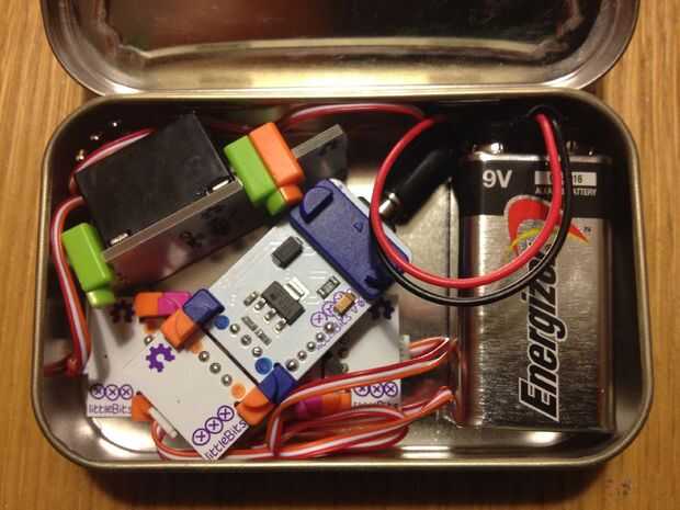 1 - los LittleBits y batería encajan perfectamente en la bandeja pero tienes que hacer las cosas justas para realmente poder cerrar la tapa y el sensor de línea. No lo fuerce si la tapa no cierra como podría afectar la LittleBits. Puede tener a un poco con que todos los cables hacia abajo en su lugar, pero una vez que están las cosas en sus lugares correctos que la tapa se cierra fácilmente.