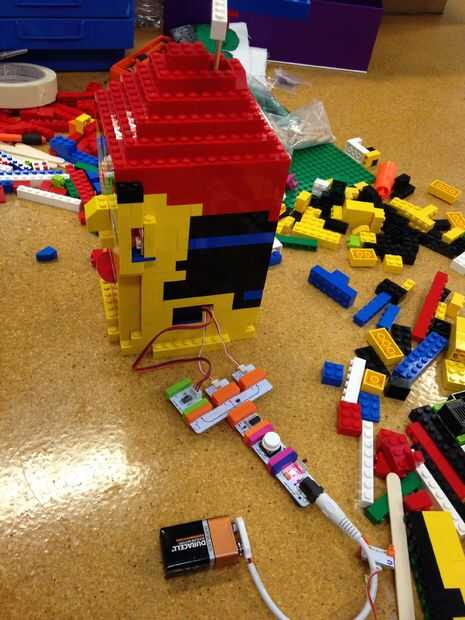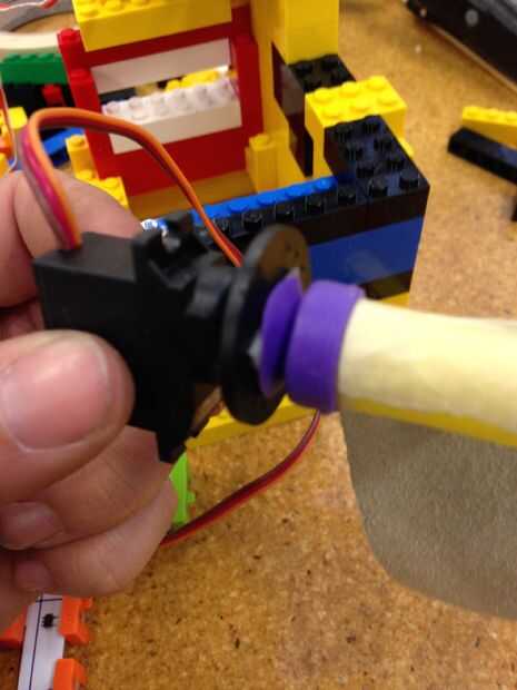 Los Legos no ajuste perfectamente alrededor de servo, usé ese espacio extra para mi otros cables de los LEDs y el motor de la C.C. a través de.