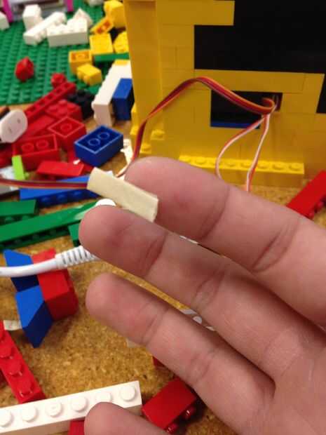 Tomé una pequeña tira de cinta adhesiva, doblado sobre un par de veces en un rectángulo fino, el rodado firmemente alrededor de la punta de la vara - entonces me deslicé la hélice de Lego en la parte superior... VOILA! C ' est parfait!