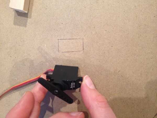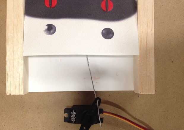 Cuando el disparador del movimiento en activado, deben mover los ojos de lo normal en el juego de miedo. Coloque el brazo del servo en la base de la plataforma de cartón pluma y probar para asegurarse de que los ojos se alineen con el retrato en ambas posiciones. Una vez que esté satisfecho con la ubicación, traza la base del servo.