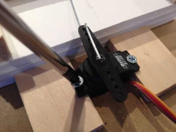 Luego cortar dos piezas de ¼" Tilo espesa para montar el servo a. Flanquean los costados del agujero que sólo se cortan con las dos piezas del basswood. Fijar con tornillos pequeños de la parte trasera del panel. Coloque la parte inferior del servo a través del agujero y transmitida hacia abajo hasta los dos trozos de madera con tornillos pequeños.