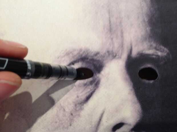 Mientras todo está alineado, con un lápiz marca donde el par normal de ojos eventualmente debe sentarse en la parte trasera a través de las aberturas de ojo.