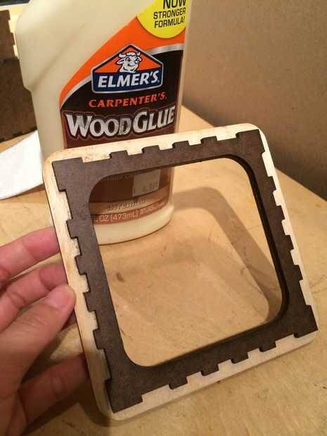 Primero, pegue las las piezas de madera contrachapada a sus correspondientes piezas de madera prensada. Estos paneles se convertirá en el frente, lateral y parte posterior de la caja de música. Utilizamos la madera para cubrir el aspecto inacabado de la madera prensada. A continuación, pegar el resto de la caja. Sin embargo, no pegar la parte trasera sin embargo, como usted tendrá que abrir con frecuencia en los siguientes pasos.