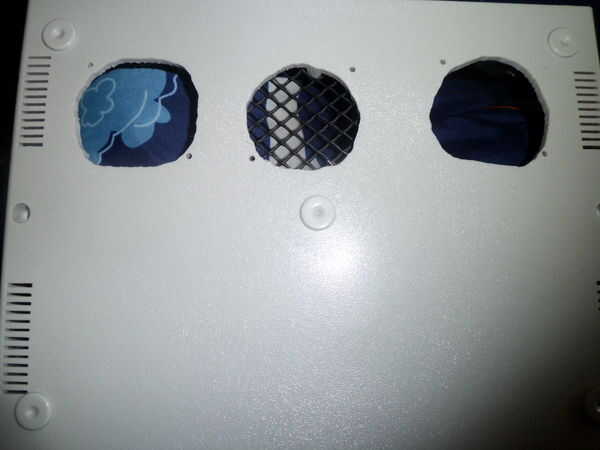 Después de taladrar los cuatro orificios principales, alinee los ventiladores sobre los orificios y asegure que haya suficiente espacio para la rotación de las cuchillas de giro. Use un marcador para marcar los puntos de las esquinas de cada ventilador para perforar agujeros más pequeños para montar los ventiladores. Al menos, haga dos orificios para montar cada ventilador; excepto el ventilador de la computadora. El ventilador más grande requerirá cuatro tornillos de montaje. Los fans de littleBits deben ante de la forma donde aspira el aire exterior dentro de la caja. El ventilador de la PC debe hacer frente donde sopla el aire fresco. Taladré un agujero pequeño en la parte inferior de la caja para conectar un mini trípode.