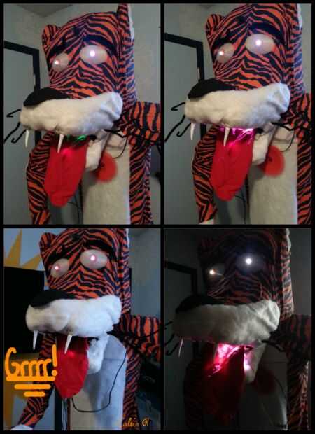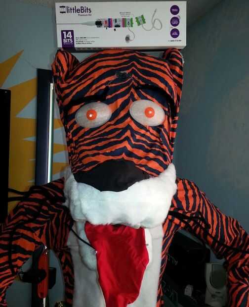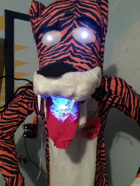 Saludar a littleBitty Joe! Joe es la mascota de mi escuela! Hablar a Joe y reloj que levante sus cejas, bigotes vibran, ojos iluminan, vuelta del corazón y escuchan RUGIR! No sólo afecta su rugir trabajo con nuestro proyecto, pero sin duda puede trabajar con su proyecto de littleBits demasiado! Su proyecto podría hablar, gritar o decir cualquier cosa!