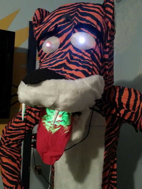 Además, he añadido una lámpara dentro de la boca del tigre. Se necesita un Color cambiar bombilla y un juego de lámpara de Home Depot. Montar la lámpara y montar en el interior de la boca. Introduzca el enchufe por el interior de la boca en la sección principal de la cabeza. Coloque la bombilla en la lámpara, enchufe el cable en un tomacorriente y ver los colores iluminan! Efectos muy cool.