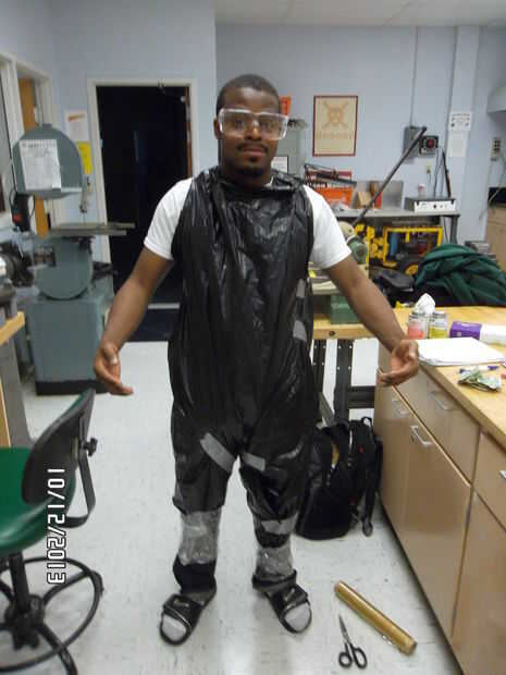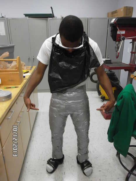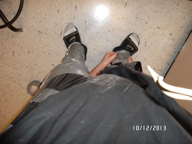 En primer lugar, cortar tres agujeros en la bolsa de basura para su cabeza y los brazos para caber a través. Tire la bolsa de basura encima y usar como un vestido [lol]. Tu pareja necesita cortar ranuras en la parte delantera y trasera de la bolsa hacia su cintura, por lo que la bolsa puede envolver alrededor de cada pierna. Además, tu pareja debe envolver cada pierna con envoltura de plástico hacia los tobillos. Agarrar la cinta y empezar a envoltura de los tobillos a la cintura. Ser prudente no para envolver demasiado apretado alrededor de las piernas, se puede desmayar! Abrigo de dos capas para asegurar la estabilidad. Ahora hacer el hokie pokie, luego usted la vuelta a ti mismo! Una vez que la sección inferior entera, cortar la cinta por los lados de cada pierna. Una vez que se cortan los "pantalones", con cinta adhesiva hacia atrás con cinta adhesiva. No hay apuro para cortar, le prometo que usted no quiere tratar con las consecuencias sangrientas!