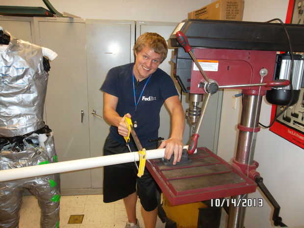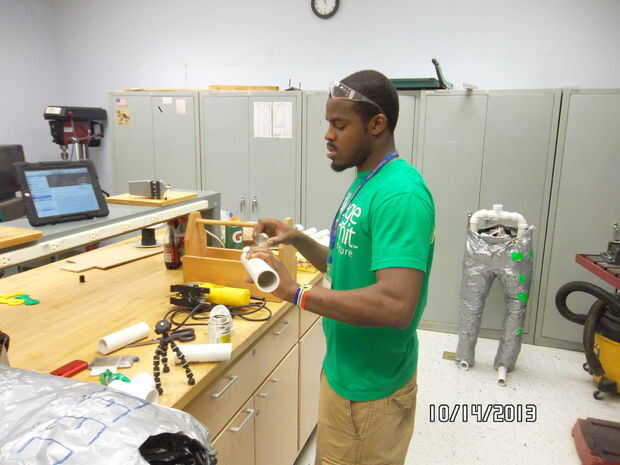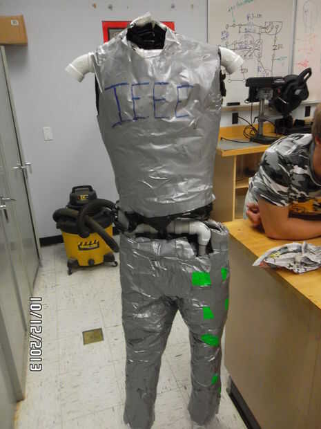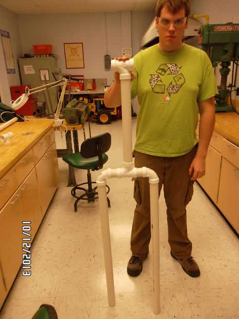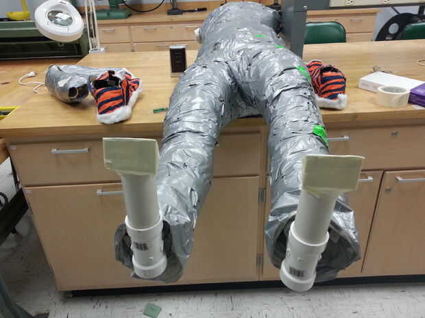 El esqueleto se colocará dentro de la demanda con cinta del conducto. Usted necesitará el tubo de PVC (4) conectores T (4) conectores de codo de 90 grados + (2) conectores de codo de 45 grados + cemento de PVC + Sierra + Banco de trabajo + medición cinta + rotulador + herramienta de presentación. En primer lugar, medir la longitud de tus piernas, brazos y torso. Medir el ancho de hombro y cintura. Con esas medidas, utilice la sierra para cortar las tiras en el tubo de PVC. Usando los conectores y los tubos de PVC mide, crear un marco para el juego. Ver la segunda imagen. Utilice un conector T en la parte inferior de cada pata como la base de la estructura. Antes de sellar el marco con cemento, pegarlo por las patas de palo y tire de la sección del torso sobre los hombros del esqueleto. Usar dos 6" piezas de PVC de la pipa en la parte delantera inferior conectores en T para equilibrar el maniquí. Sello el esqueleto con cemento, salvo el conector T que conecta la columna vertebral a las caderas y los brazos.