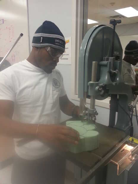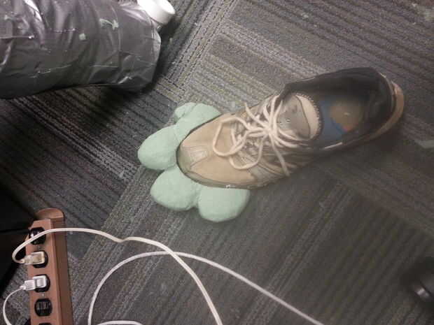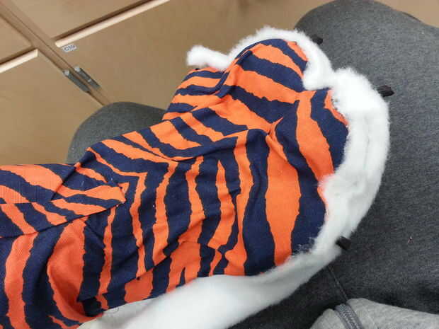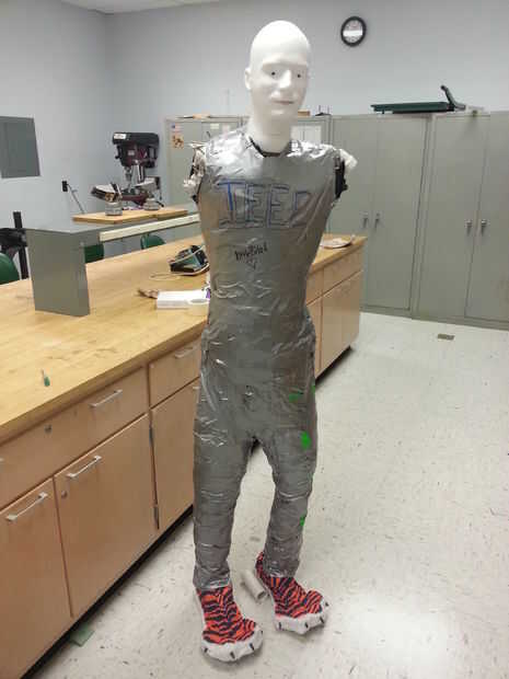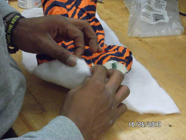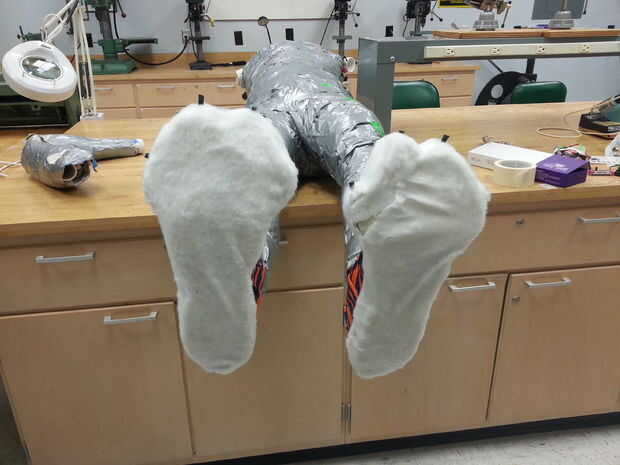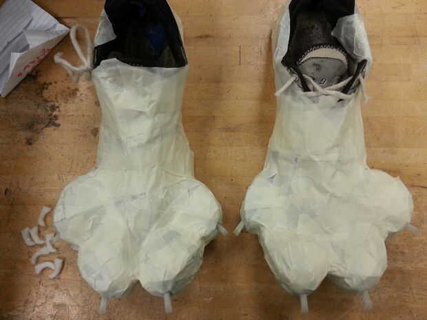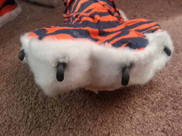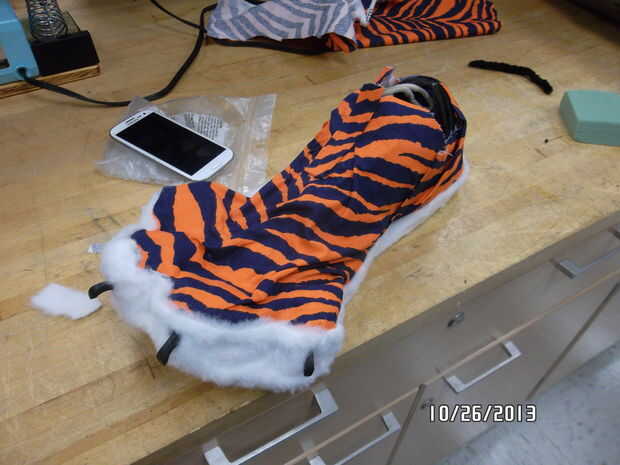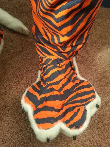 En este paso se necesita un bloque de 2" de espuma de poliestireno, zapatos viejos + cinta adhesiva + cuchillo del Exacto cuchillo eléctrico + pistola de pegamento caliente + tela + tigre con rayas (8) 3-garras impresas en tela + tijeras. Comenzar con seguimiento del contorno del frente de la mitad de la zapatilla en la espuma bloque y con el rotulador, dibuja cuatro dedos del contorno. Después de dibujar el contorno del zapato y los dedos del pie, utilizar el cuchillo eléctrico para cortar la espuma en exceso. Con un par de tijeras o el cuchillo del exacto, alrededor de los dedos del pie en forma de dedos de los pies tigre. Después de redondeo, use la pistola de pegamento caliente para pegar los dedos de los pies a la parte delantera de la zapatilla. Cubra el zapato entero con cinta de enmascarar y meter cuatro agujeros en los dedos del pie para dar cabida a las garras. Comenzar a añadir a la tela a rayas de tigre en el zapato. Recuerde, más arrugas = aspecto realista. Montar las garras con pegamento caliente dentro de los agujeros. Después de completar la tela de rayas de tigre, cubrir la parte inferior de la zapata con tela blanca. Hacer el mismo proceso para el otro pie. Después de terminen los pies, puesta en el maniquí y colocar los brazos.