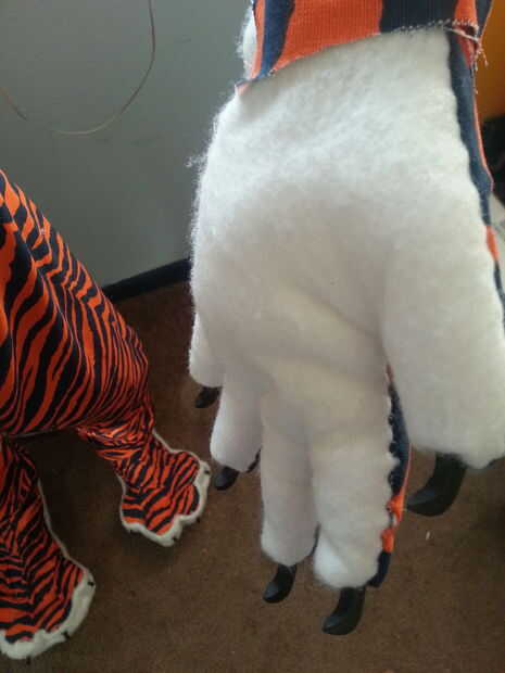 Las patas son bastante simples. ¿Que ha dibujado un pavo con la huella de su mano? Esto será el mismo concepto, sólo crear guantes! Trace la mano en el interior de la tela a rayas de tigre y la tela blanca. Una vez trazado, corte a lo largo del contorno de la mano con unas tijeras. Interior al reves, coser a las dos telas juntas y rellenar con algodón. Utilice pegamento caliente para pegar las garras en los dedos. Pegar las manos a las mangas de los brazos.