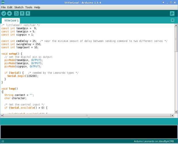 Configurar los pines utilizados para las banderas de ida y vuelta y la meta! signo. El módulo Arduino sólo tiene fácil acceso a la salida de D1, D5 y D9 pines. D5 y D9 deben cambiarse a modo de PWM. En el código en el momento el equipo local (team0) es pin D9, el equipo visitante es D5 y el símbolo es D1.