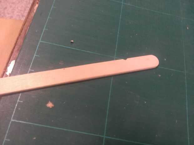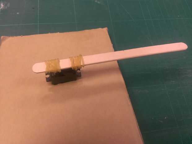 Encontrar un buen palo (por ejemplo, el tipo usado para helado, pero preferiblemente una usada!) que será la palanca. Fije en el servo de alguna manera. Aquí utilicé gomas, pero puede ser cualquier otra cosa que funcione para usted. En la parte superior (pero no en la parte superior total) del palo hacen una pequeña cuña. Es donde cabe cadena del bolso de té, y se utiliza para mantenerlo deslizando hacia abajo la palanca mientras que se levanta.