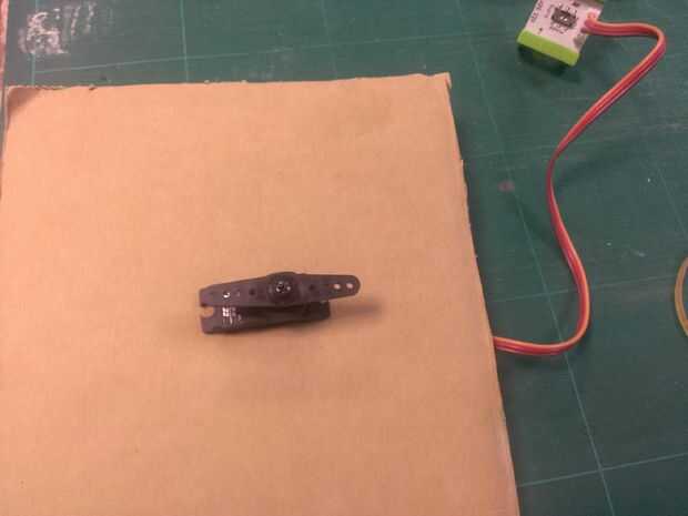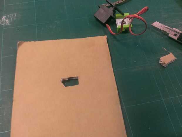 Más arriba en el tablero de cortan una ranura cuadrada adecuada para montar el servo. Debe ser muy cómodo así! Puede cortar dibujando el contorno del servo en el tablero, o directamente cortar alrededor del servo llevó a cabo en la Junta (sólo tenga cuidado de no cortar los cables del servo). Desenchufe el servo desde el módulo de littleBits, así que pasa por el agujero y luego vuelva a conectarlo.
