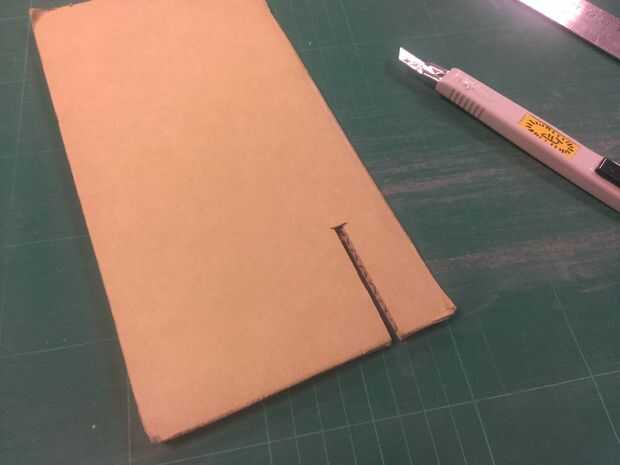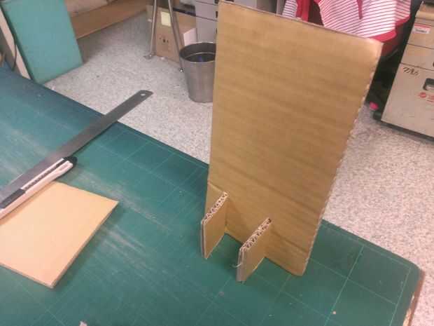 La cartulina tiene que estar bastante sólido. Corte dos líneas verticales en un pedazo de cartón de altura (~ 20-25cm?). Cortar otras dos piezas que encajan allí. Las ranuras originales deben ser lo bastante estrechas como para que las piezas de montaje no mueva mucho (en todos).