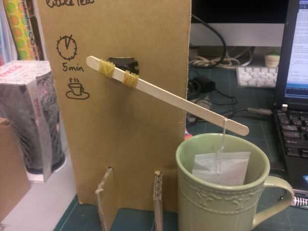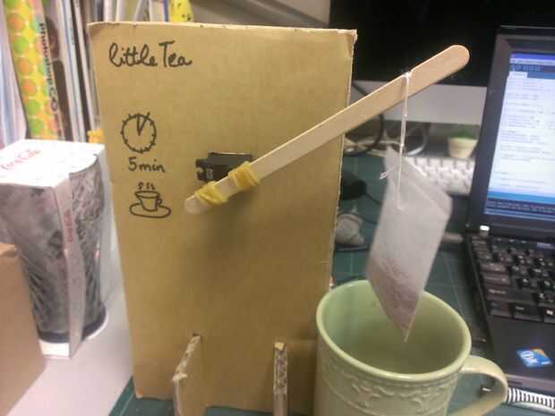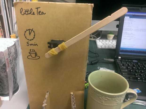 El código fuente para el módulo Arduino está en el imrehg/littleTea repositorio en Github. Los valores de servo de la off (no cerveza) y en caso (elaboración de la cerveza) son codificado allí, y usted tendrá que ajustar esos valores (basados en prueba y error) para tener una buena configuración. El bolso de té debe estar completamente fuera de la taza de té originalmente. Cuando se baje debe sumergir.