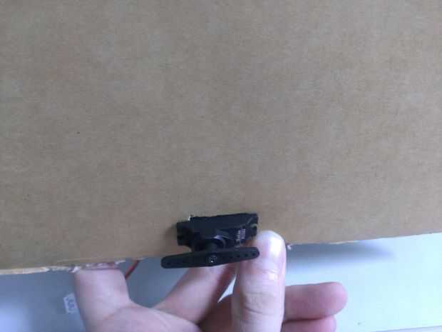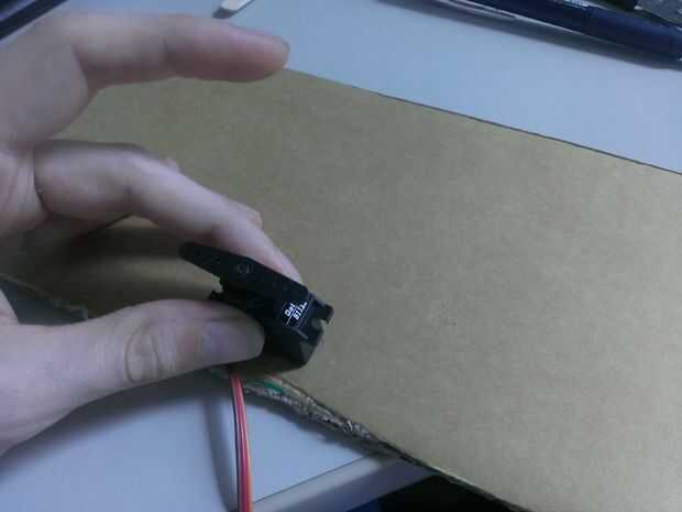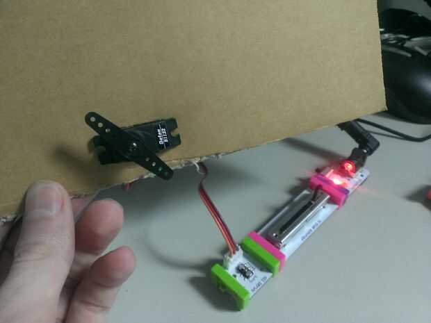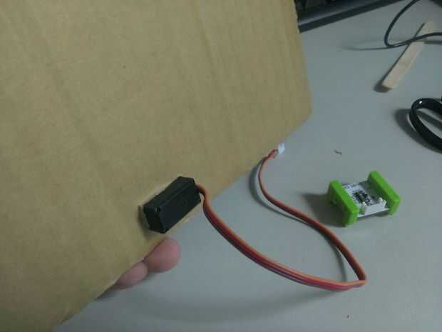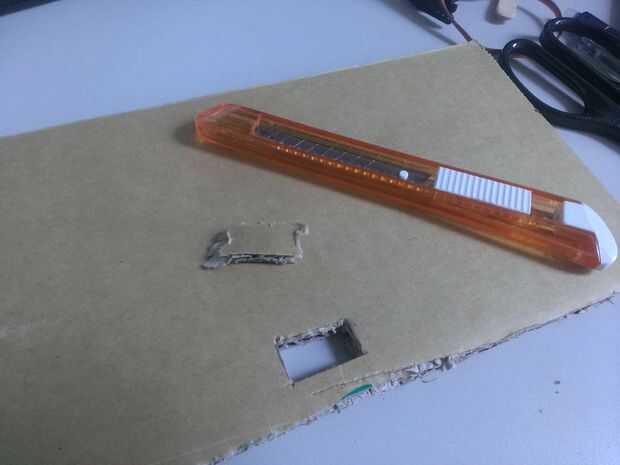 Corte un orificio adecuado en la cartulina con el cuchillo. Puede marcar el contorno del servo para que sea fácil. Debe encajar bien allí. La cartulina debe ser lo suficientemente grande para ser una pantalla de buen tamaño. Para enhebrar el servo a través del orificio, desconecte el módulo de littleBits primero.