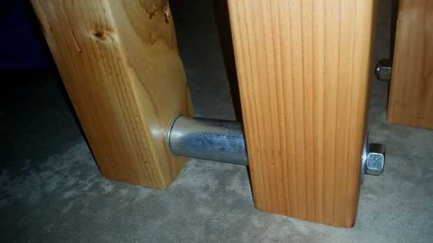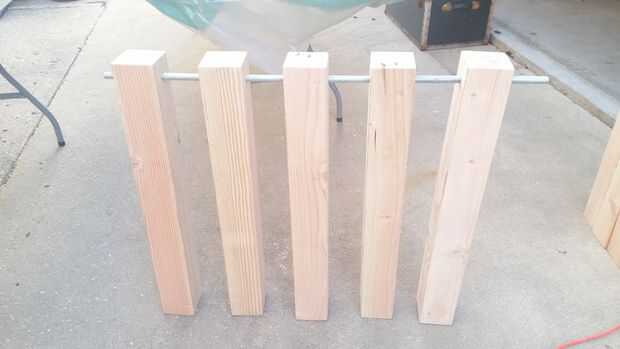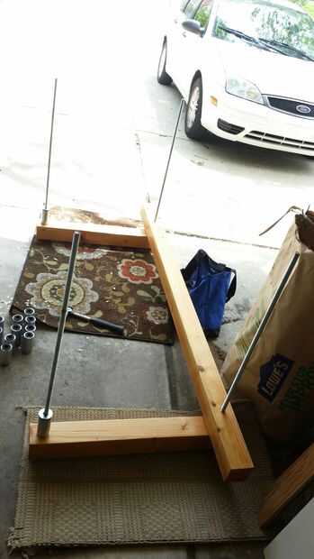 Building the base for the table and bench took a lonh time. Estaba debatiendo para ir con esta idea que era mi idea original o con negro pipa Base he visto en Pintrest, contento me fui con mi propia idea. The Home depot corta el 4 x 4 para mí pero estaban lejos, tuve que cambiar el tamaño de todas ellas otra vez, los agujeros perforados a través de todas las piernas usando mi nuevo taladro, corte el tubo galvanizado hasta trozos de 3,5 pulgadas, usa 5/8s arandelas, tornillos y 3 pies de varilla roscada. (1 pie para el Banco), utiliza aislante de la tubería de agua al centro de mis espaciadores (pipa galevenized). Base también se lija varias veces y termine con Sam Maloof acabado al aceite.