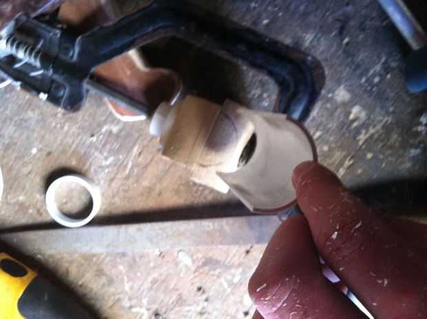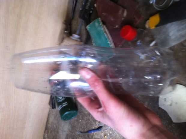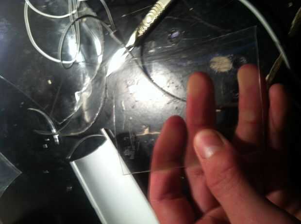 A continuación corté una pieza cuadrada de plástico de una botella, lo lijada y caliente había pegado en el lugar en el medio tubo de PVC.