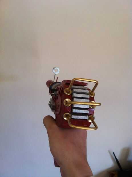 Para el acabado he añadido las barras rectangulares en la parte posterior junto con las barras dobladas con arandelas. También he añadido a los dos switches. También he añadido las tiras de aluminio para otra vez que se vea mejor. En el cañón más pequeño he añadido a un apuntador usando un clavo recto y una arandela. También mencioné la pintura donde necesita. También añadí masilla para madera en huecos pequeños y pintado sobre él.